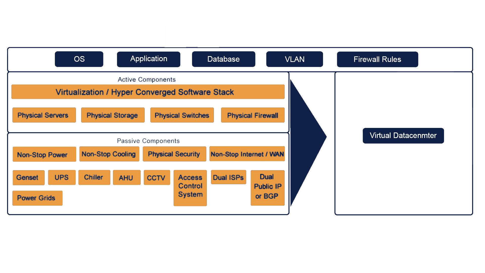 A Virtual Data Centre is the pool of virtualized resources like CPU, Memory, Storage, Network and Security that offers the same features and components as a hardware data center, with the difference that these components are emulated, i.e. produced by software. This allows us to adjust performance parameters and components in a few moments.